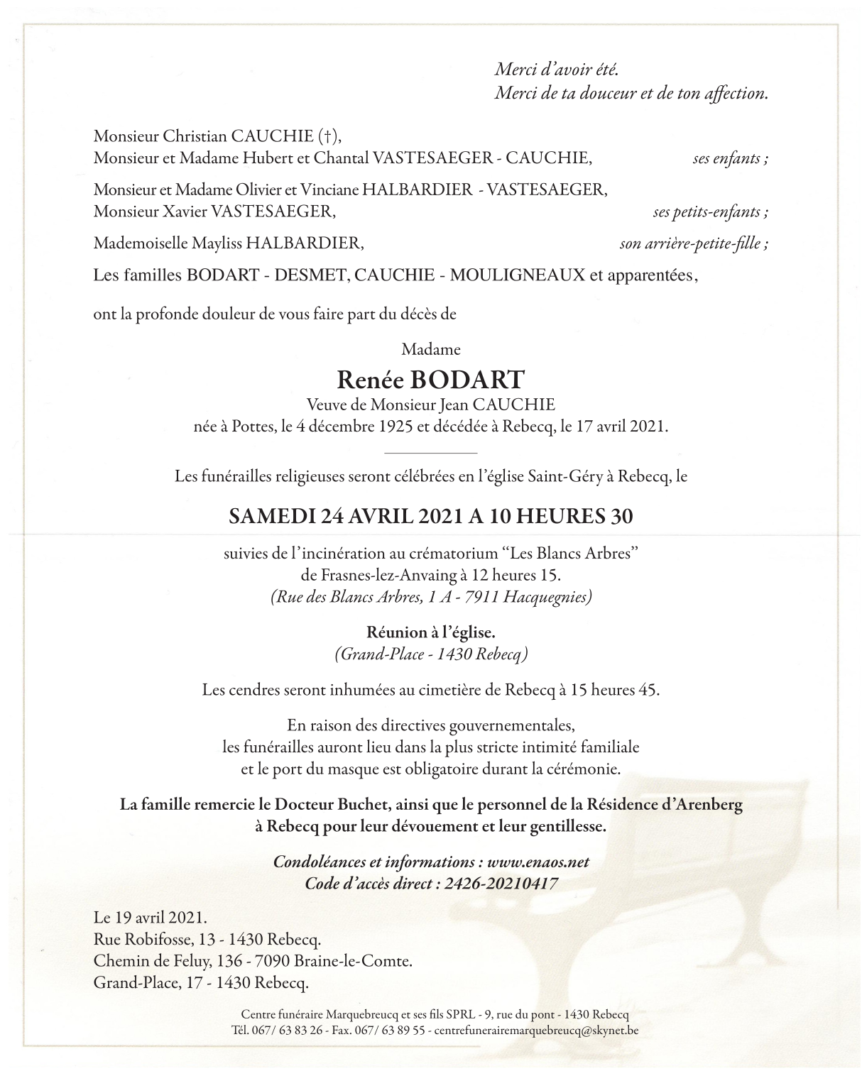 Died in Rebecq (1430) on 17 April 2021 at the age of 95 years