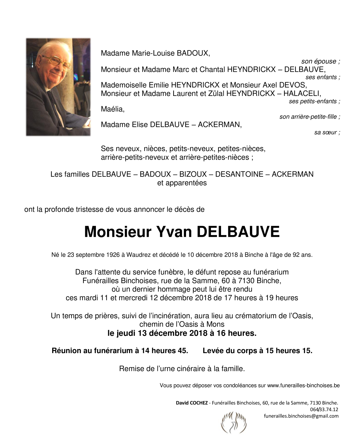 Décédé à Binche (7130) le lundi 10 décembre 2018 à l'âge de 92 ans