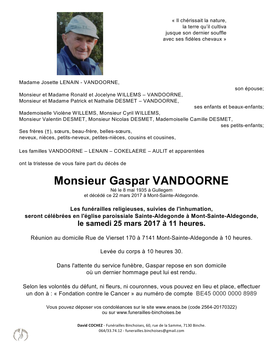 Died in Mont-Sainte-Aldegonde (7141) on 22 March 2017 at the age of 81 years