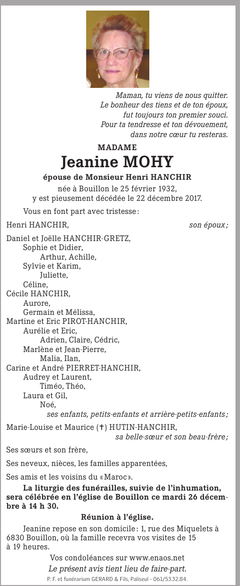 Décédée à Bouillon (6830) le vendredi 22 décembre 2017 à l'âge de 85 ans