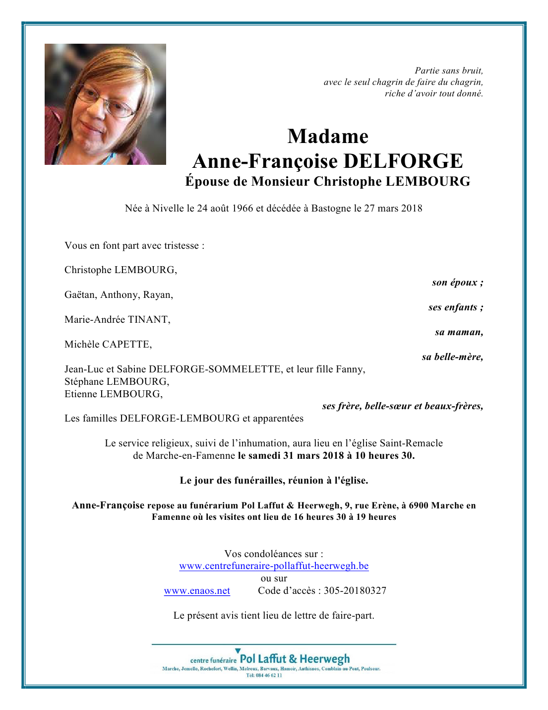Died in Bastogne (6600) on 27 March 2018 at the age of 51 years