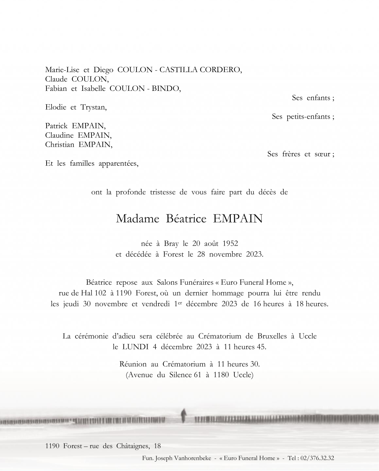 Décédée à Forest (1190) le mardi 28 novembre 2023 à l'âge de 71 ans