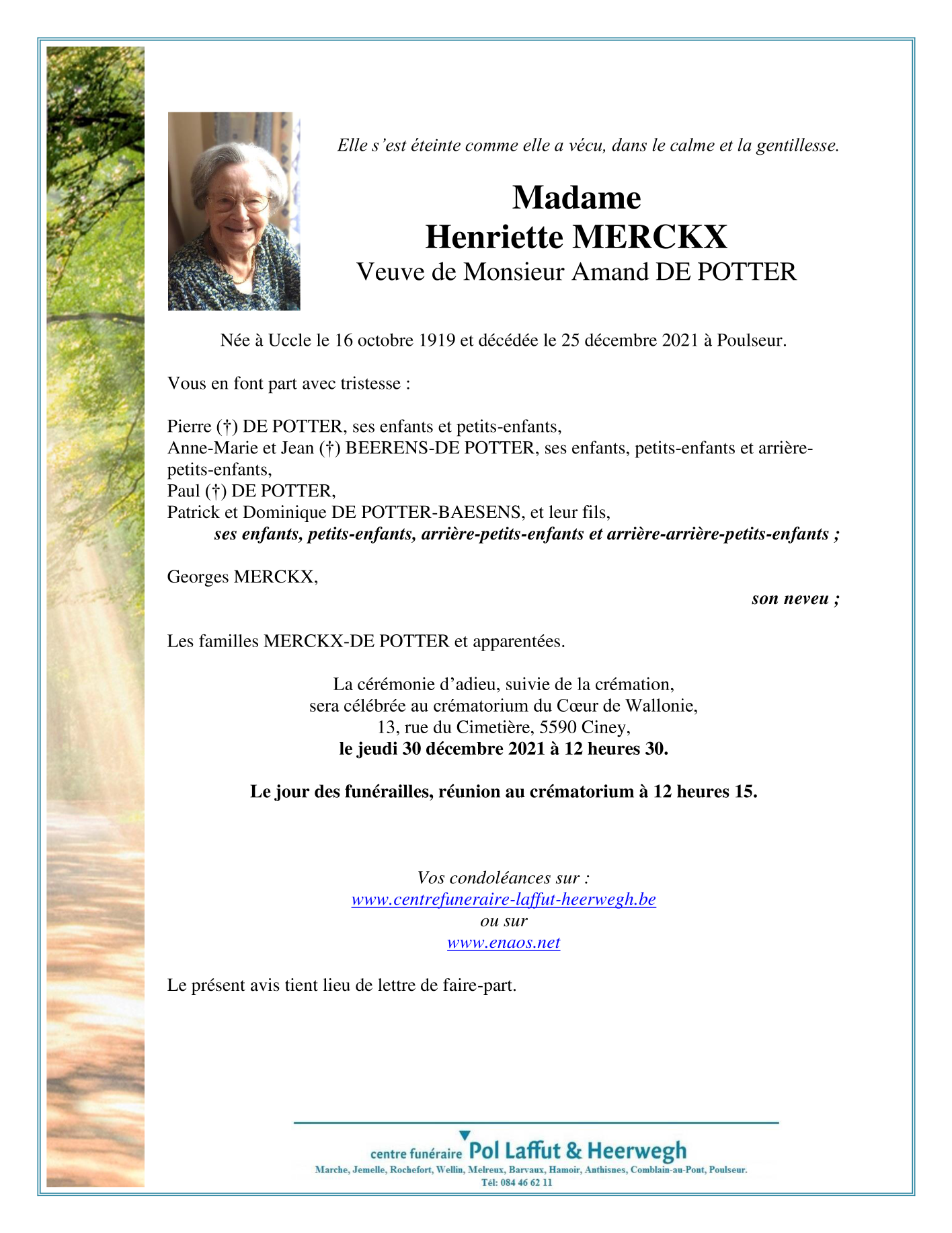 Overleden te Poulseur (4171) op zaterdag 25 december 2021 op 102-jarige leeftijd