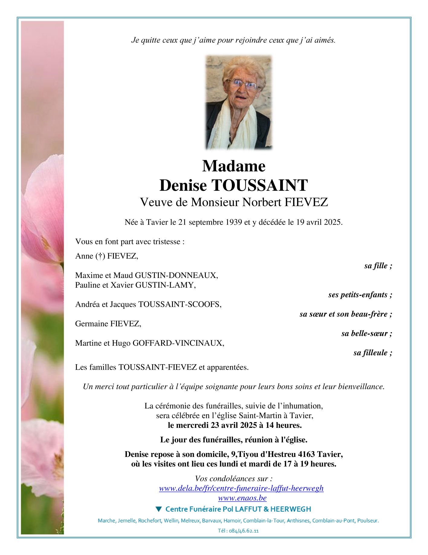 Overleden te Tavier (4163) op zaterdag 19 april 2025 op 85-jarige leeftijd