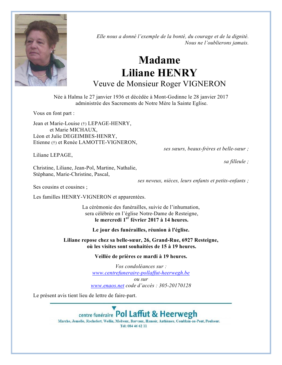 Décédée à Mont-Godinne (5530) le samedi 28 janvier 2017 à l'âge de 81 ans
