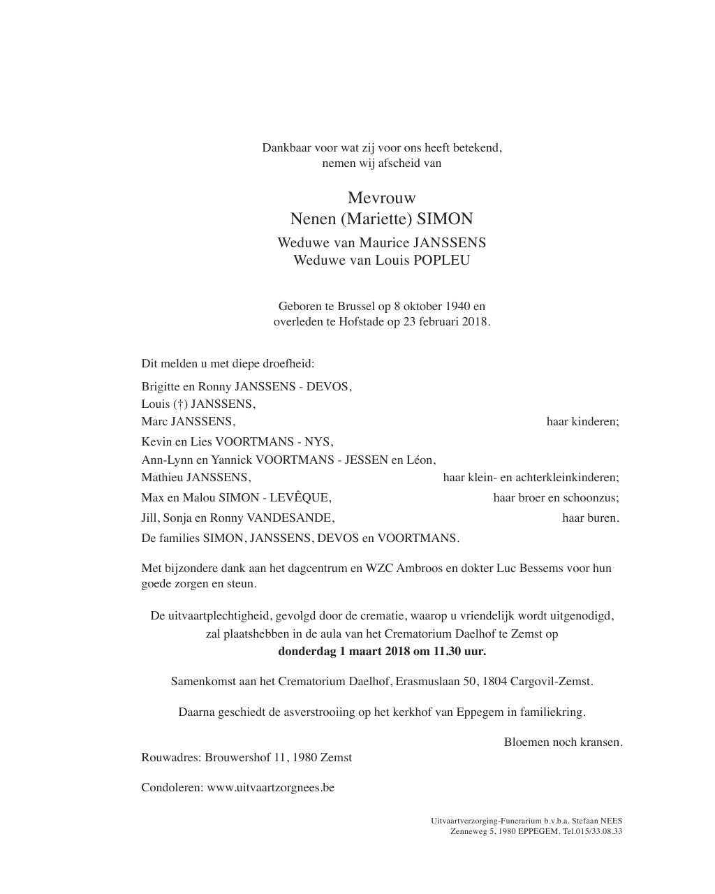 Fallecida en Hofstade (Bt.) (1981) el viernes, 23 de febrero de 2018 a la edad de 77 años