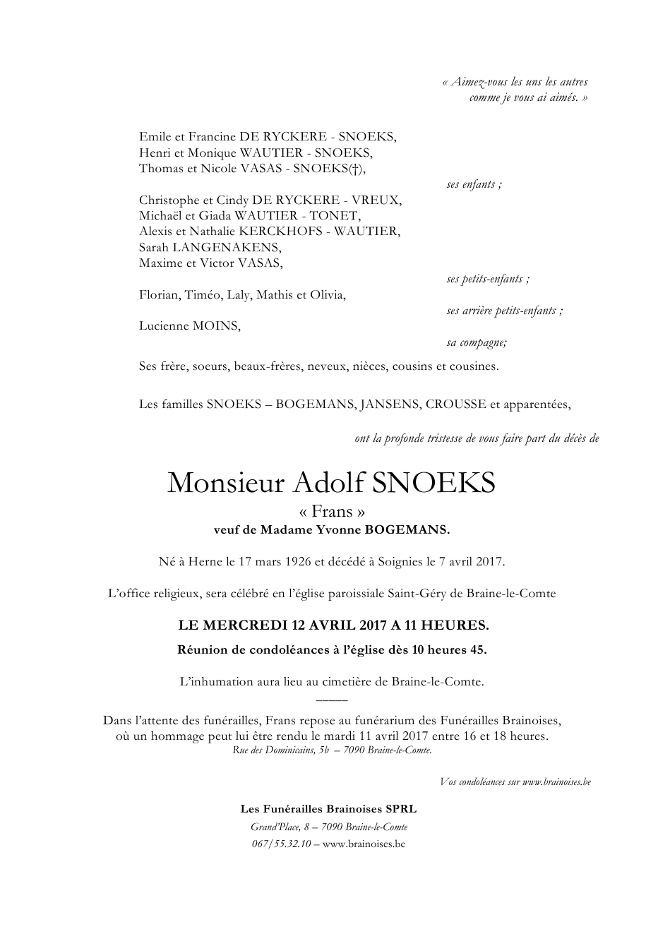 Décédé à Soignies (7060) le vendredi 7 avril 2017 à l'âge de 91 ans