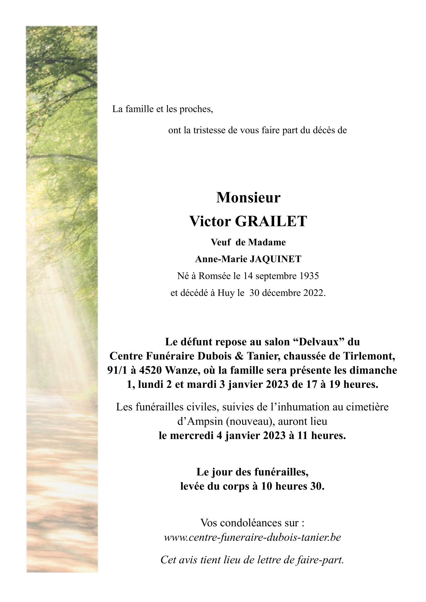 Décédé à Huy (4500) le vendredi 30 décembre 2022 à l'âge de 87 ans