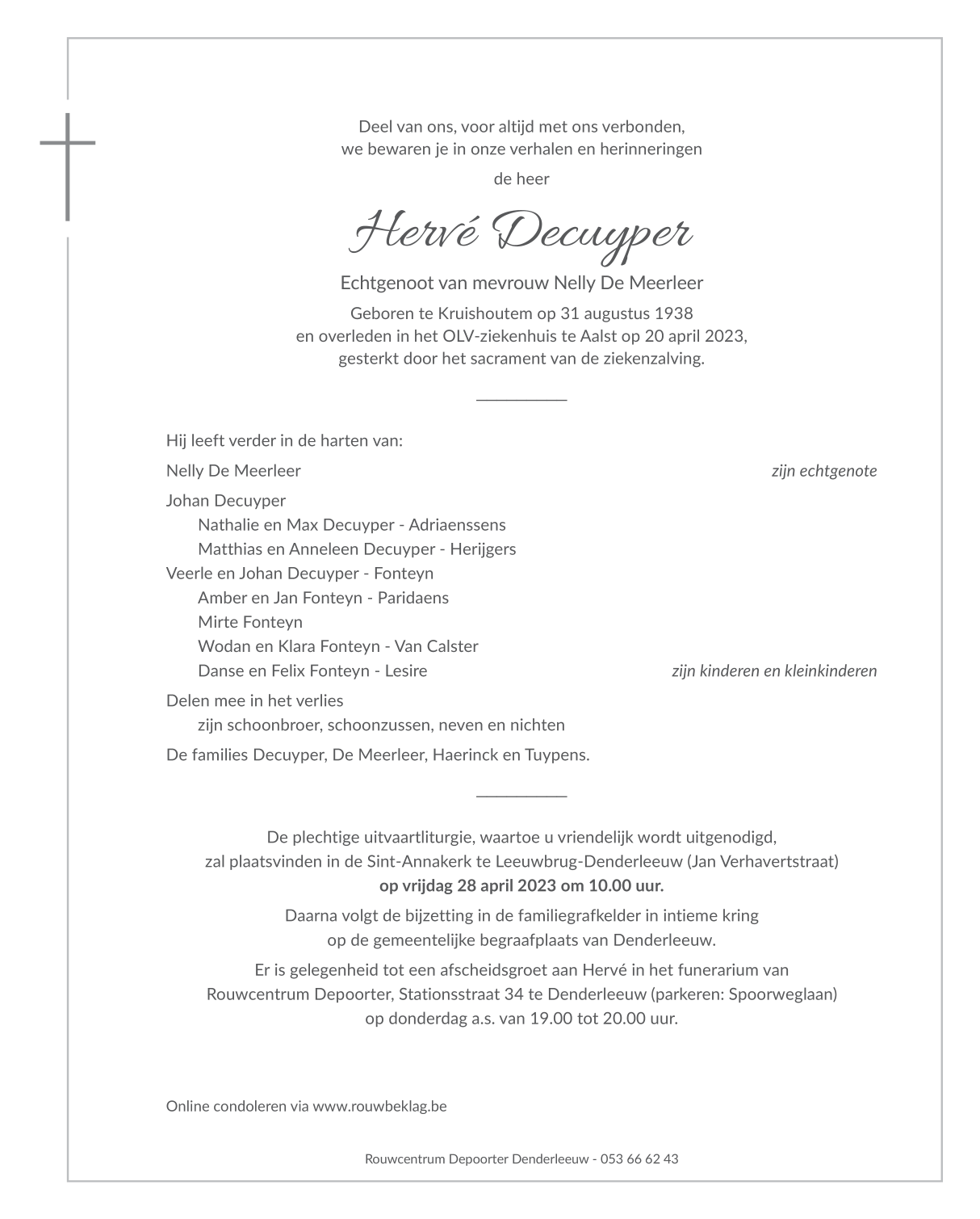 Décédé à Aalst (9300) le jeudi 20 avril 2023 à l'âge de 84 ans