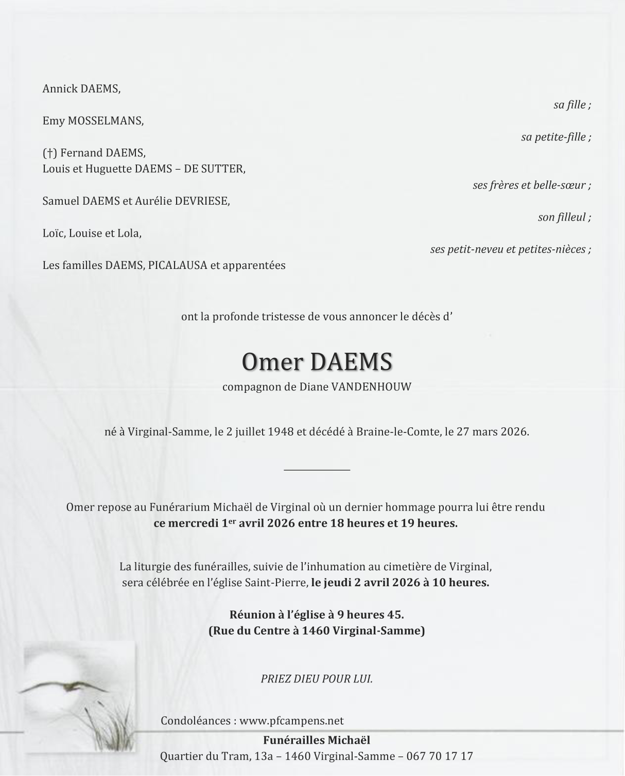 Décédé à Braine-le-Comte (7090) le vendredi 27 mars 2026 à l'âge de 77 ans