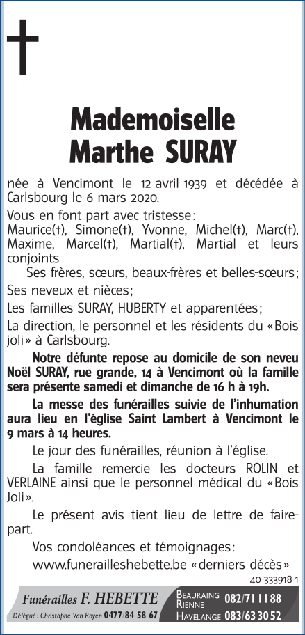 Died in Carlsbourg (6850) on 06 March 2020 at the age of 80 years