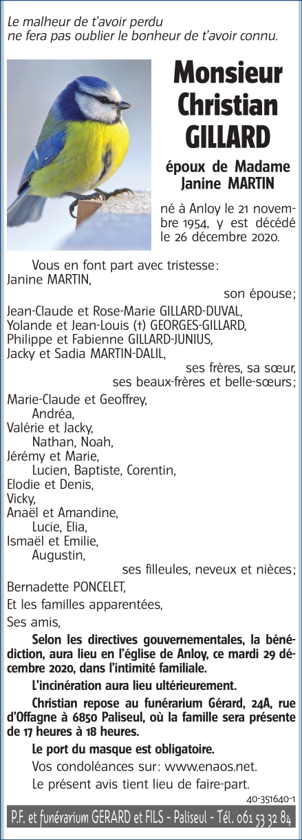 Fallecido en Anloy (6890) el sábado, 26 de diciembre de 2020 a la edad de 66 años