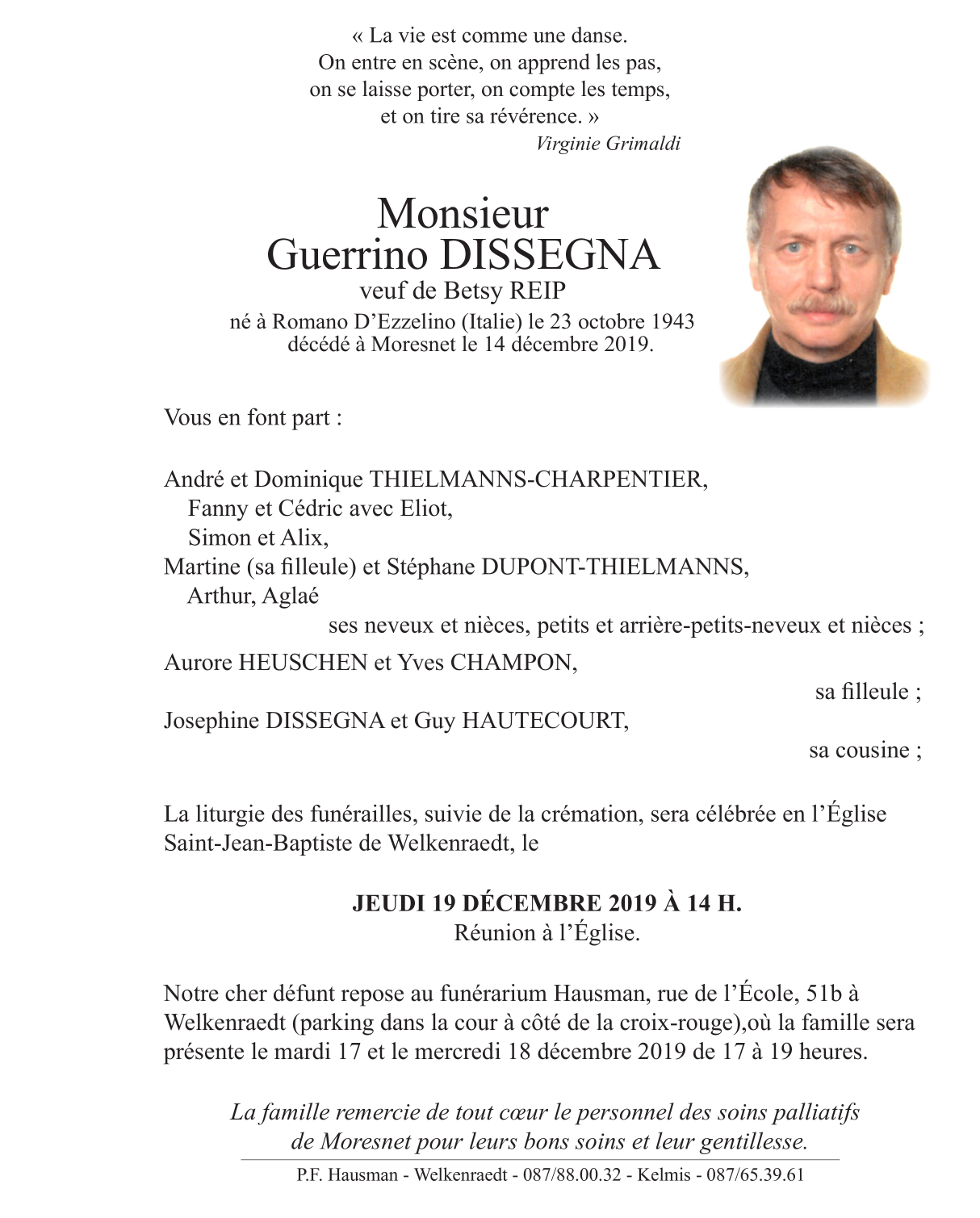 Fallecido en Moresnet (4850) el sábado, 14 de diciembre de 2019 a la edad de 76 años