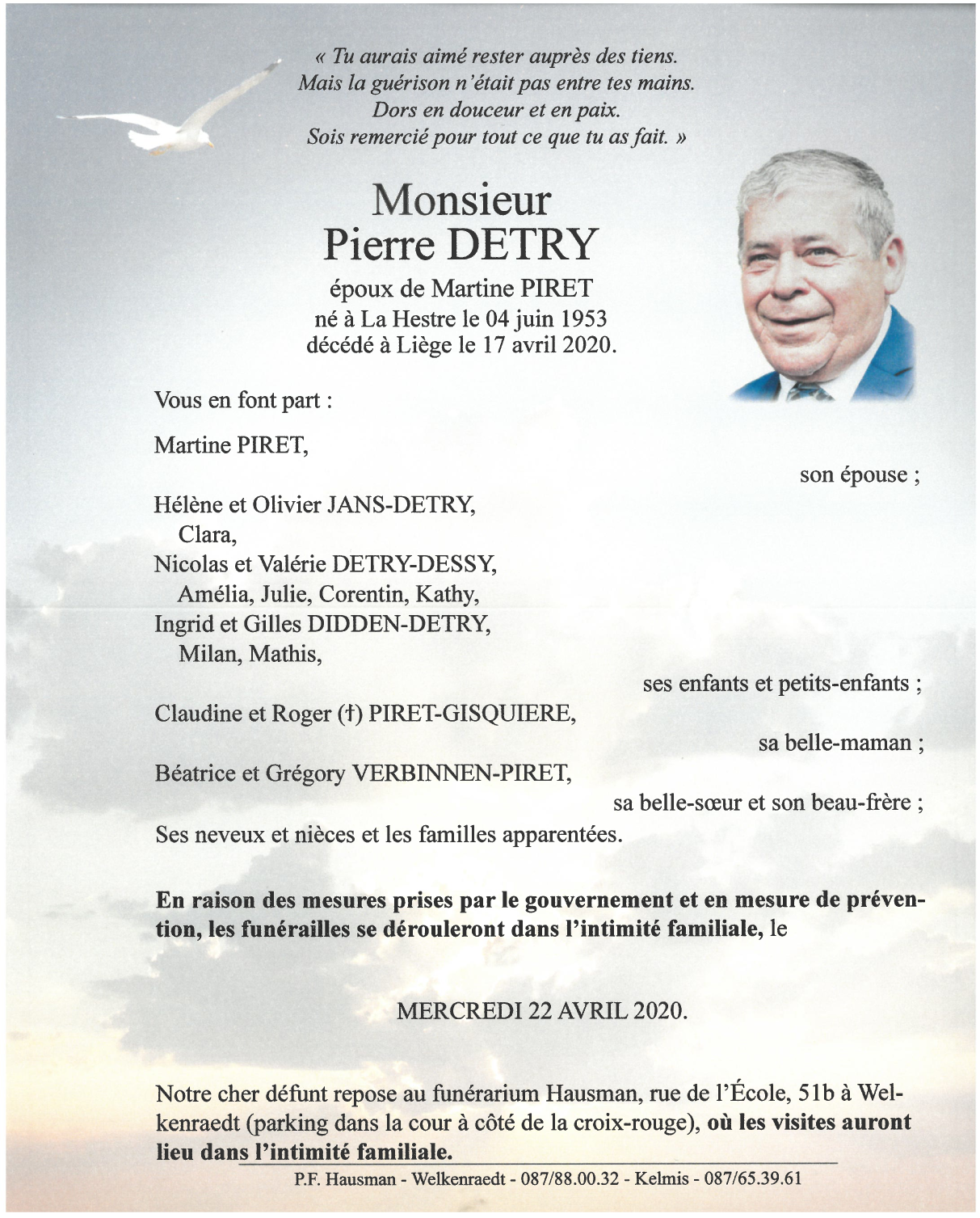 Fallecido en Liège (4000) el viernes, 17 de abril de 2020 a la edad de 66 años