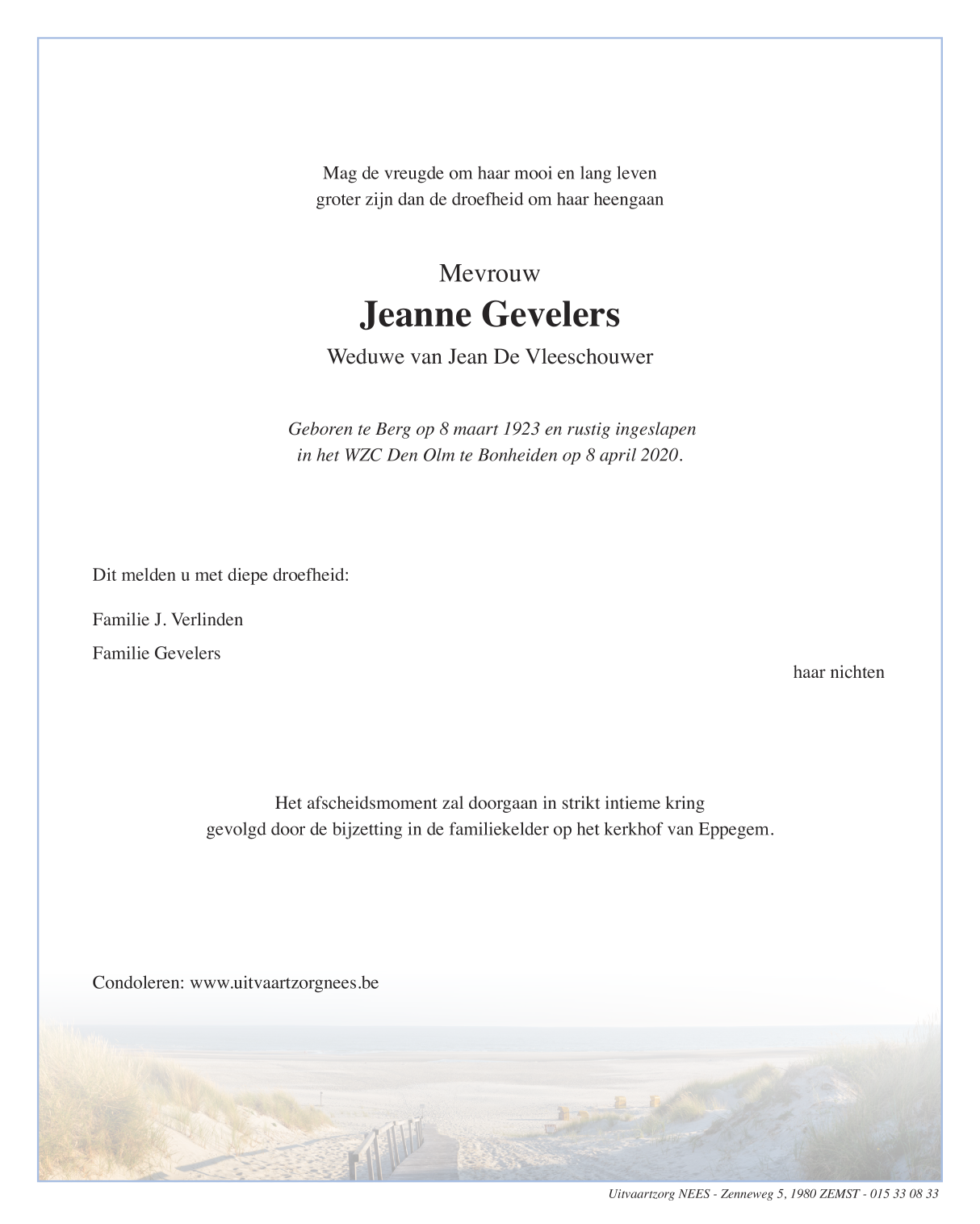 Décédée à Bonheiden (2820) le mercredi 8 avril 2020 à l'âge de 97 ans