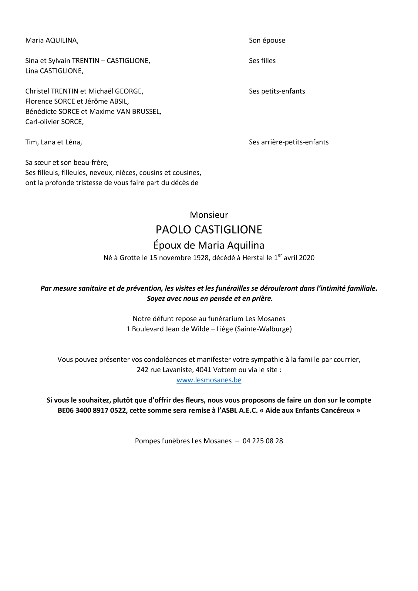 Décédé à Herstal (4040) le mercredi 1 avril 2020 à l'âge de 91 ans