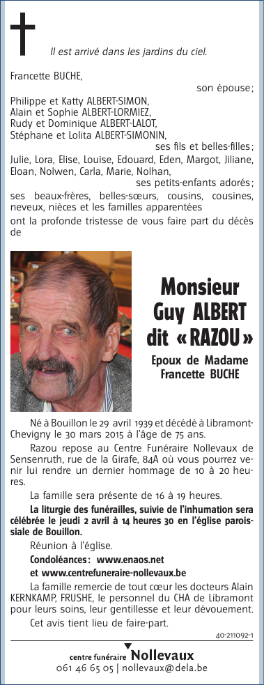 Décédé à Libramont-Chevigny (6800) le lundi 30 mars 2015 à l'âge de 75 ans
