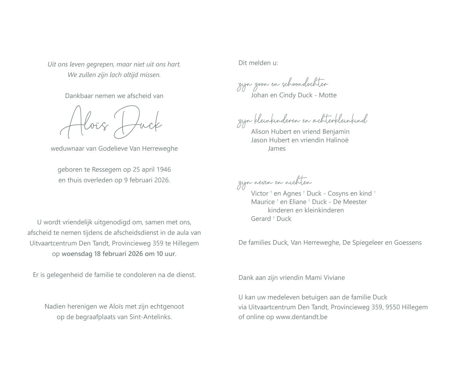 Décédé à Sint-Antelinks (9550) le lundi 9 février 2026 à l'âge de 79 ans