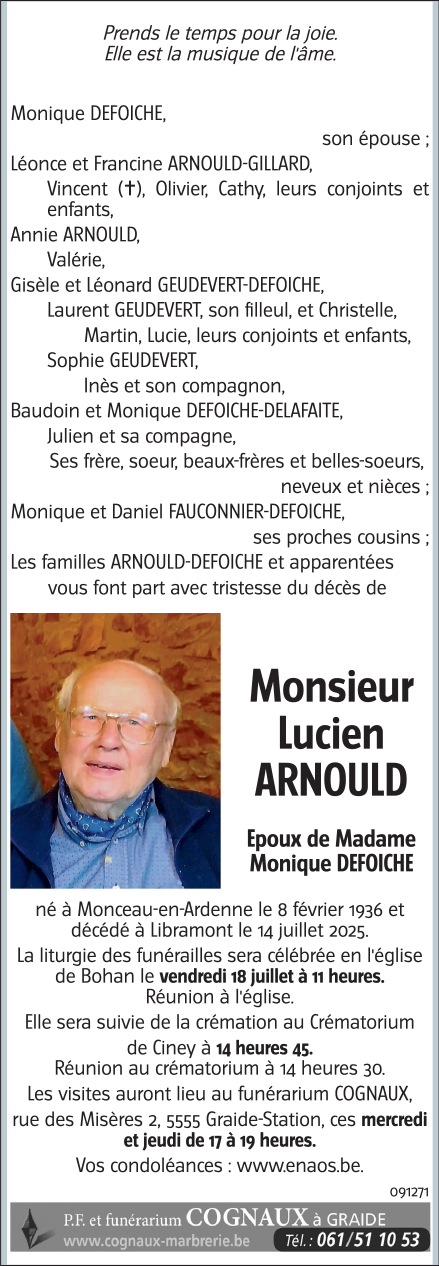 Décédé à Libramont (6800) le lundi 14 juillet 2025 à l'âge de 89 ans