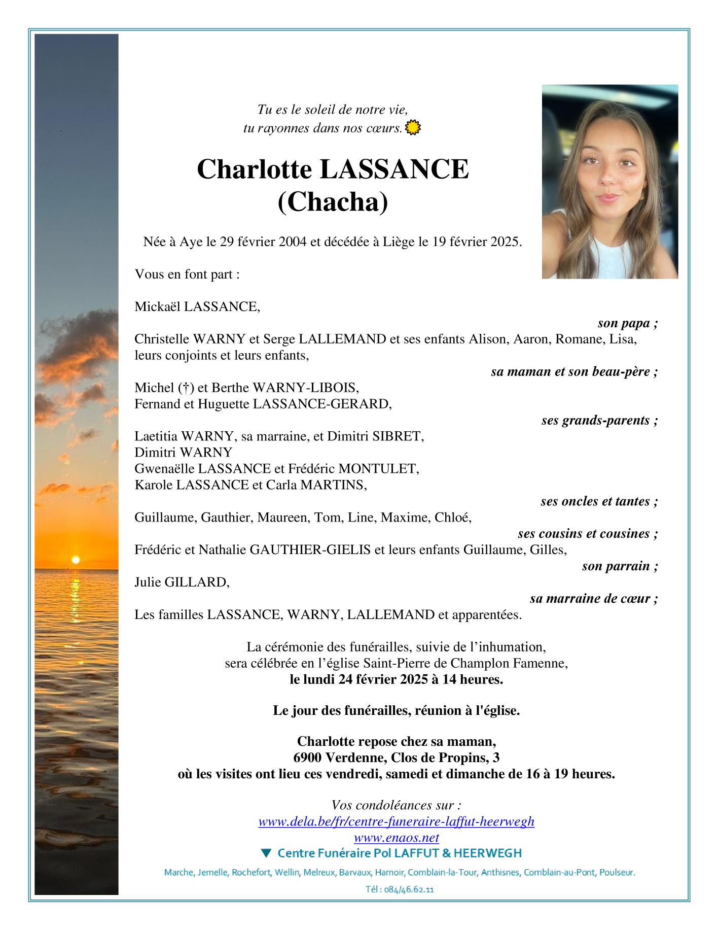 Died in Liège (4000) on 19 February 2025 at the age of 20 years
