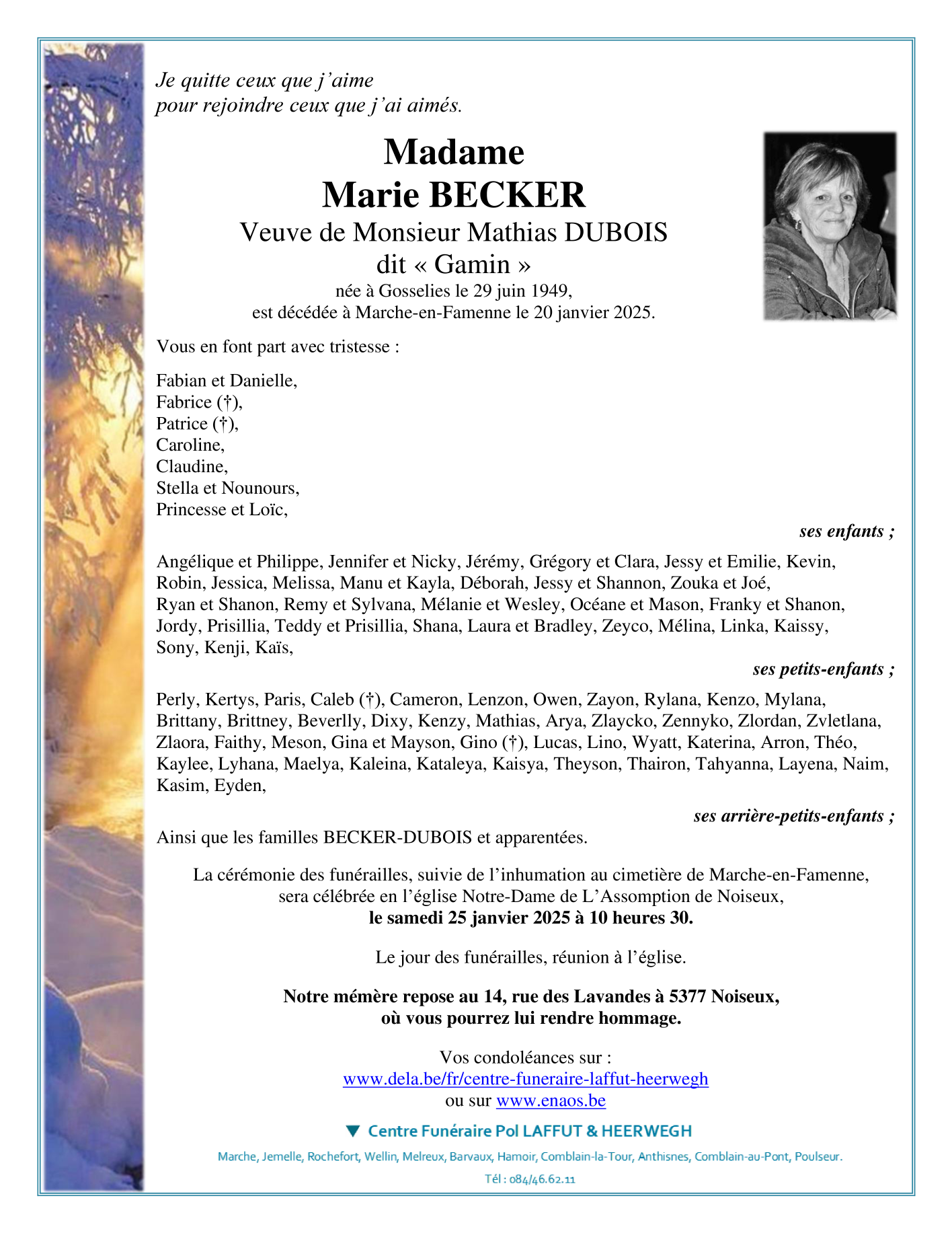 Décédée à Marche-en-Famenne (6900) le lundi 20 janvier 2025 à l'âge de 75 ans
