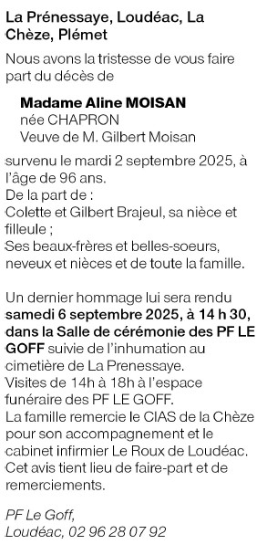 Décédée à Noyal-Pontivy (56920, France) le mardi 2 septembre 2025 à l'âge de 96 ans