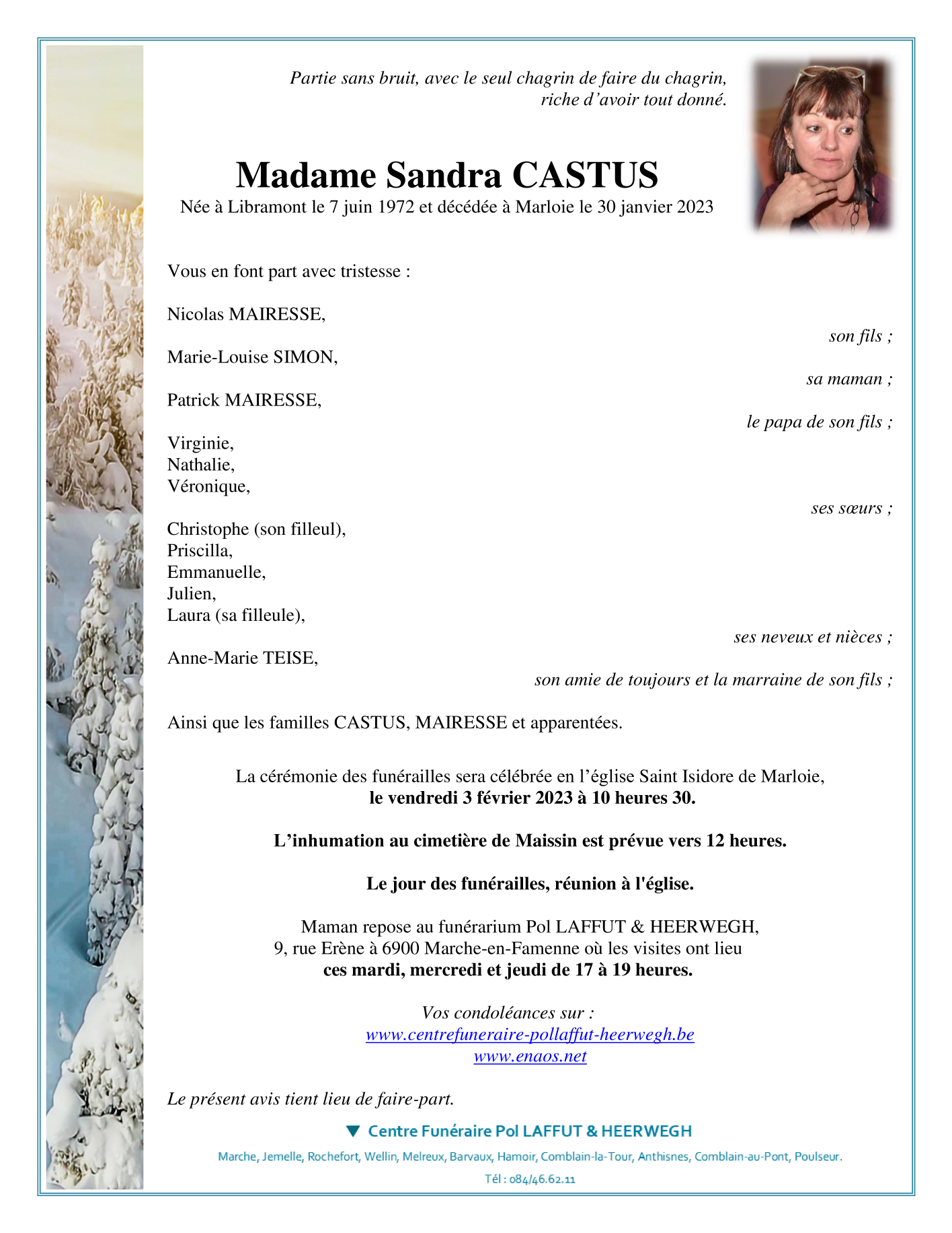 Décédée à Marloie (6900) le lundi 30 janvier 2023 à l'âge de 50 ans