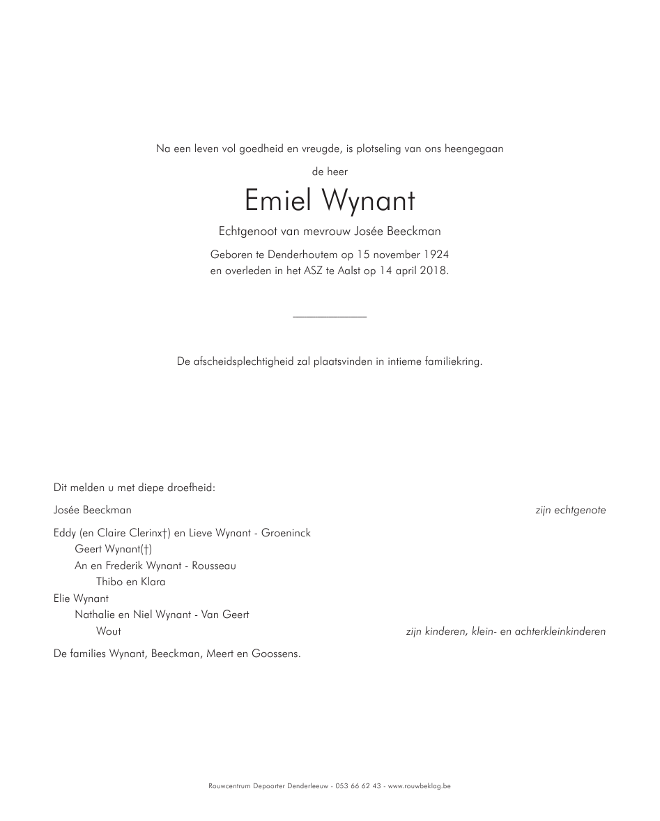 Décédé à Aalst (9300) le samedi 14 avril 2018 à l'âge de 93 ans