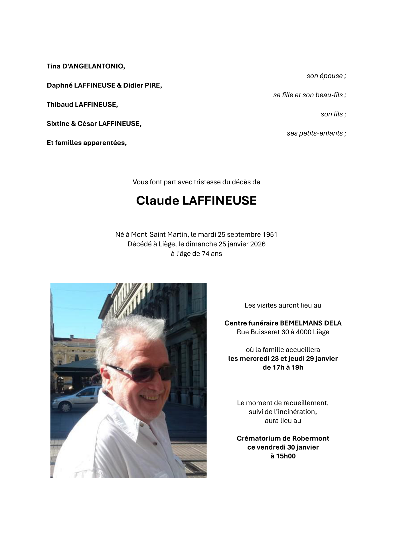 Décédé à Liège (4000) le dimanche 25 janvier 2026 à l'âge de 74 ans