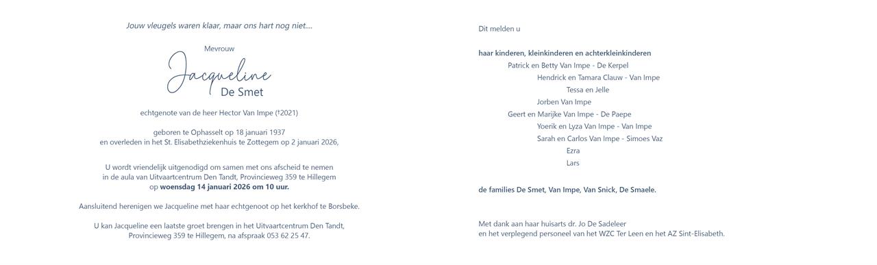 Décédée à Zottegem (9620) le vendredi 2 janvier 2026 à l'âge de 88 ans