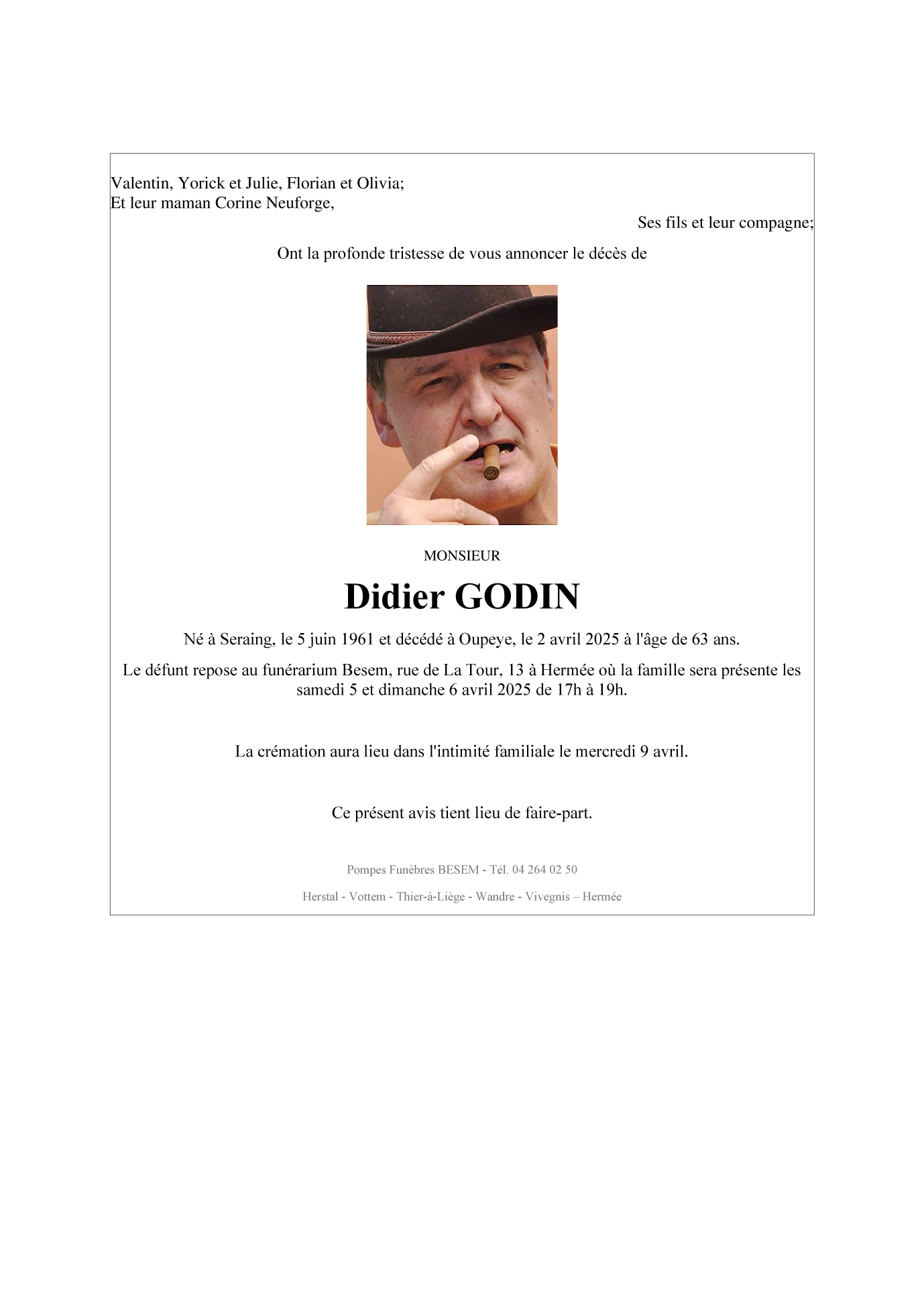 Décédé à Oupeye (4680) le mercredi 2 avril 2025 à l'âge de 63 ans