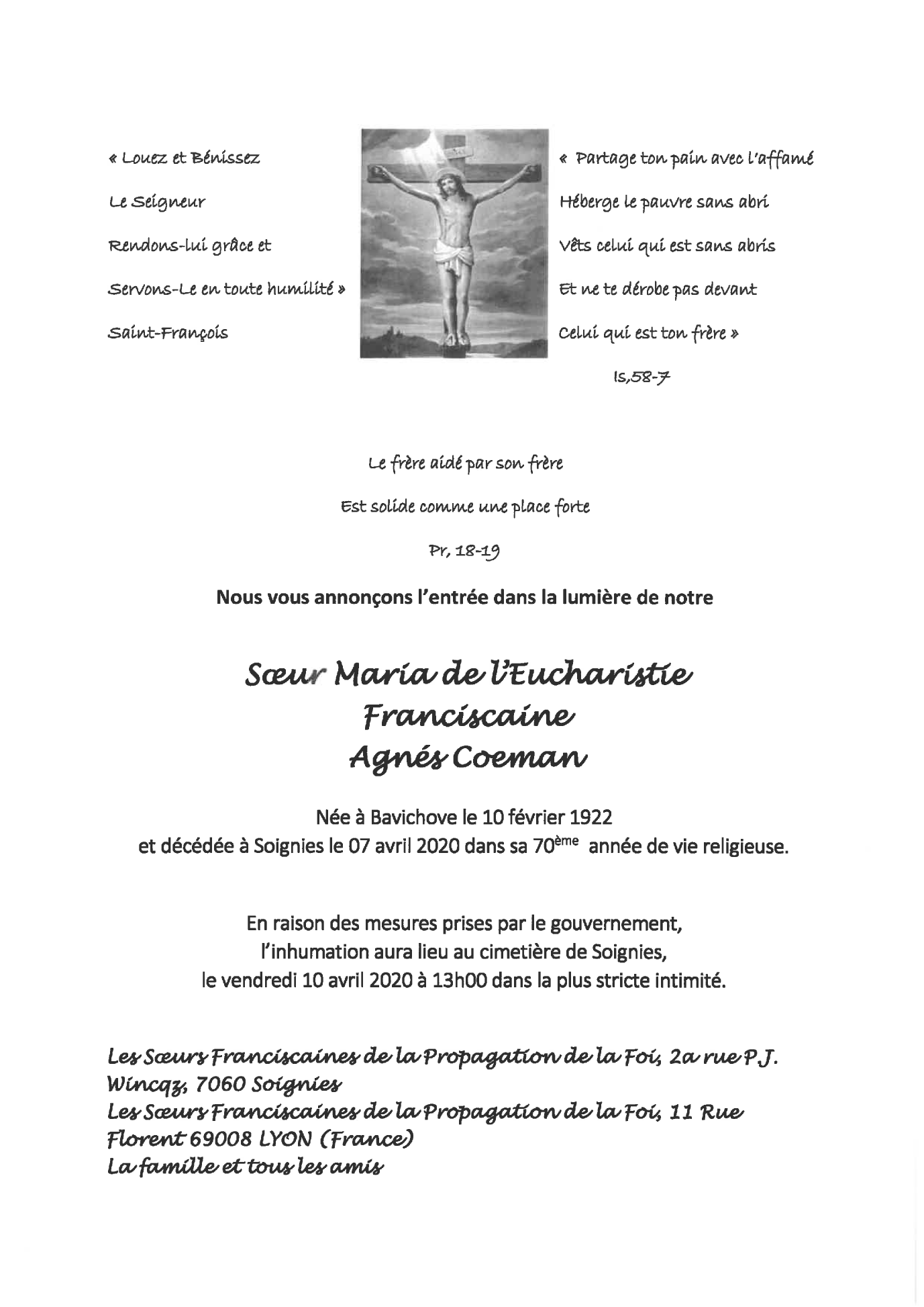Fallecida en Soignies (7060) el martes, 7 de abril de 2020 a la edad de 98 años