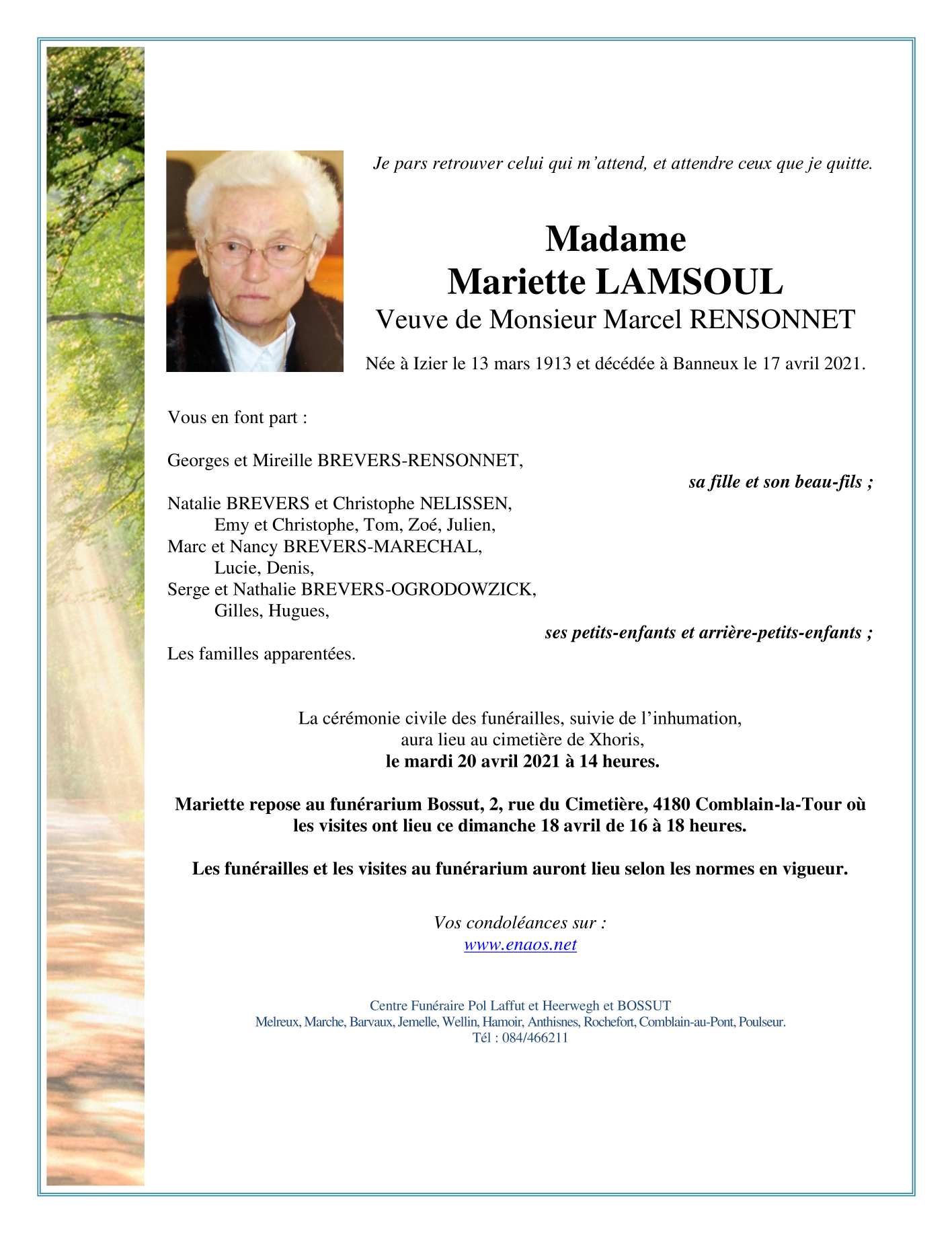 Décédée à Banneux (4141) le samedi 17 avril 2021 à l'âge de 108 ans
