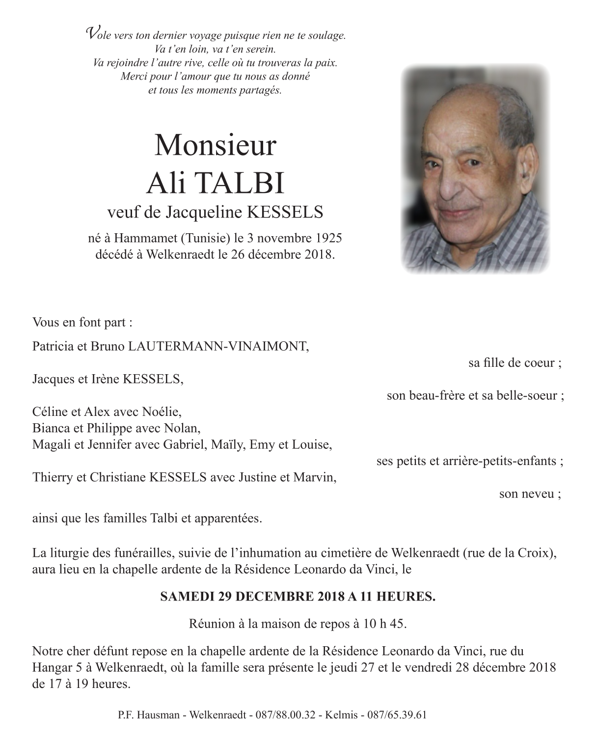 Fallecido en Welkenraedt (4840) el miércoles, 26 de diciembre de 2018 a la edad de 93 años