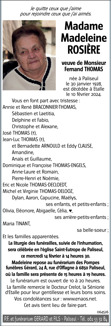 Décédée à Etalle (6740) le samedi 10 février 2024 à l'âge de 96 ans