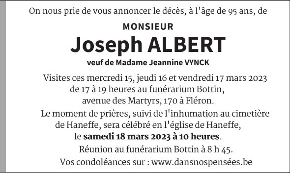 Died in Soumagne (4630) on 13 March 2023 at the age of 95 years