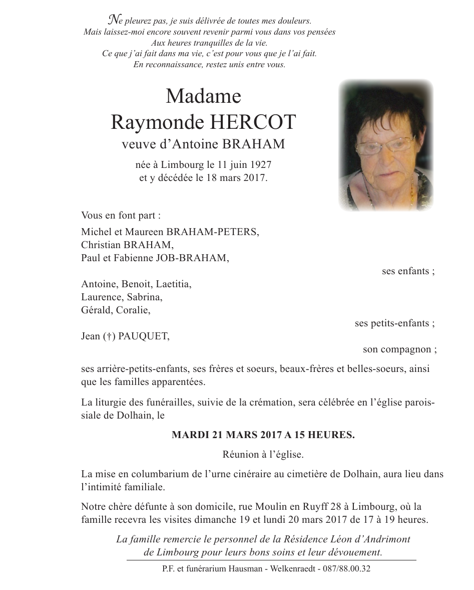Décédée à Limbourg (4830) le samedi 18 mars 2017 à l'âge de 89 ans