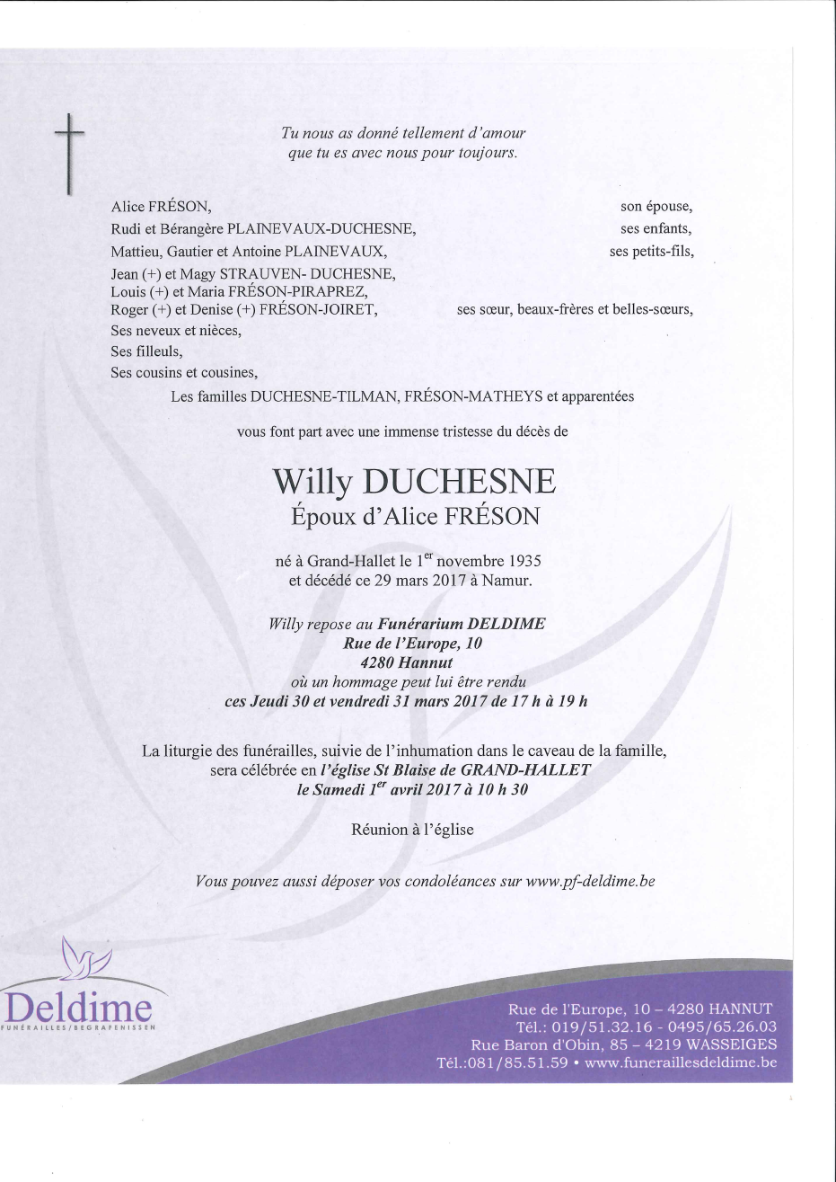 Décédé à Namur (5000) le mercredi 29 mars 2017 à l'âge de 81 ans