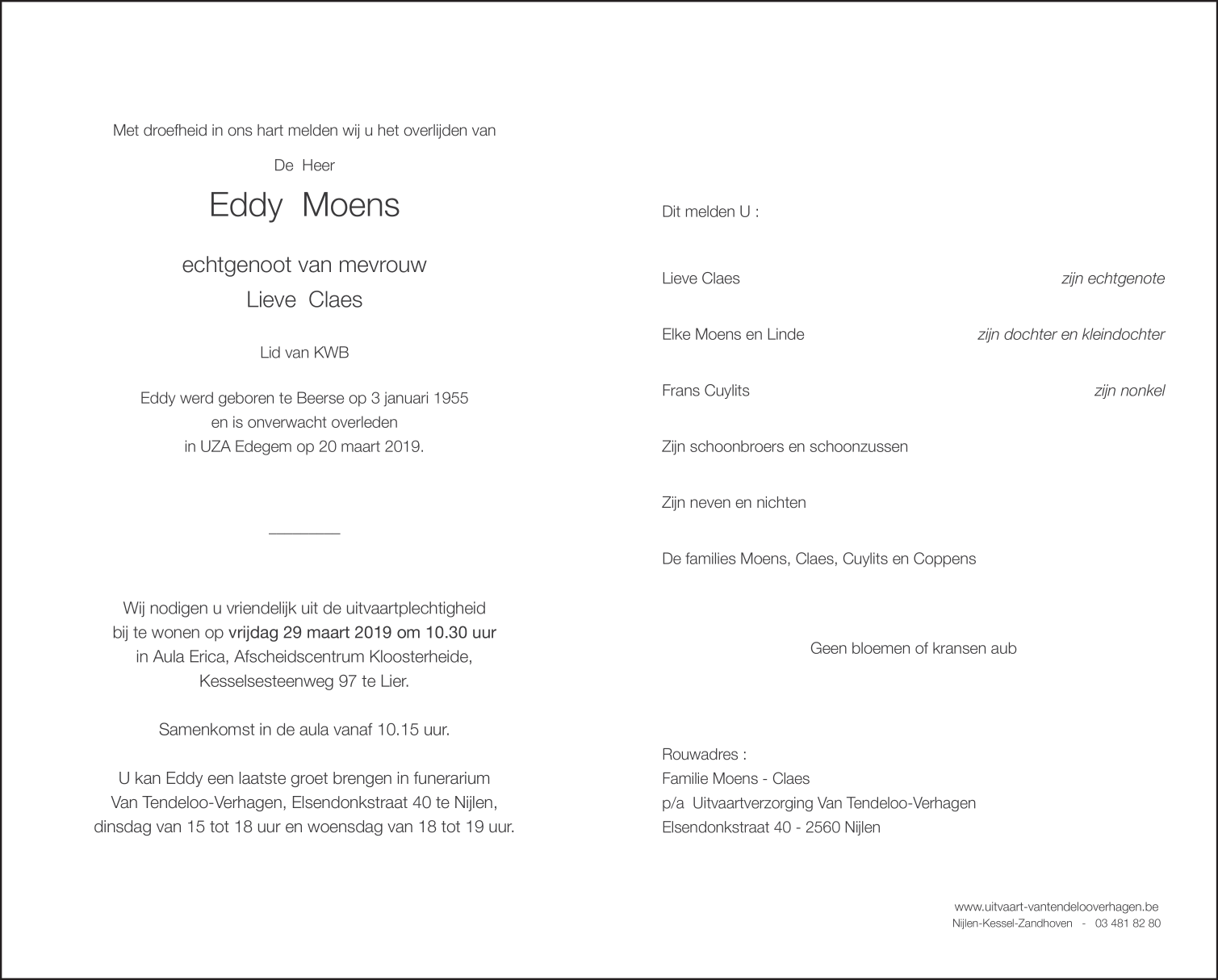 Fallecido en Edegem (2650) el miércoles, 20 de marzo de 2019 a la edad de 64 años