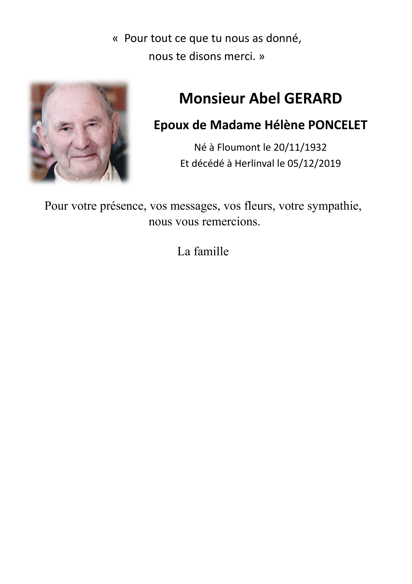 Décédé à Herlinval (6983) le jeudi 5 décembre 2019 à l'âge de 87 ans