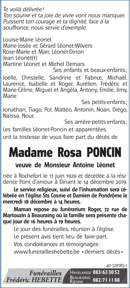 Fallecida en Dinant (5500) el sábado, 14 de diciembre de 2019 a la edad de 90 años