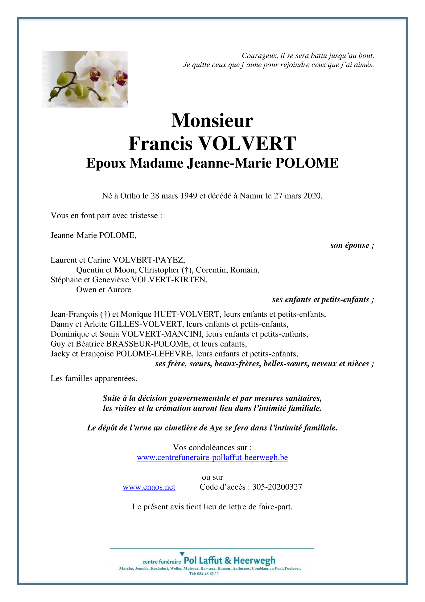 Décédé à Bouge (5004) le vendredi 27 mars 2020 à l'âge de 70 ans
