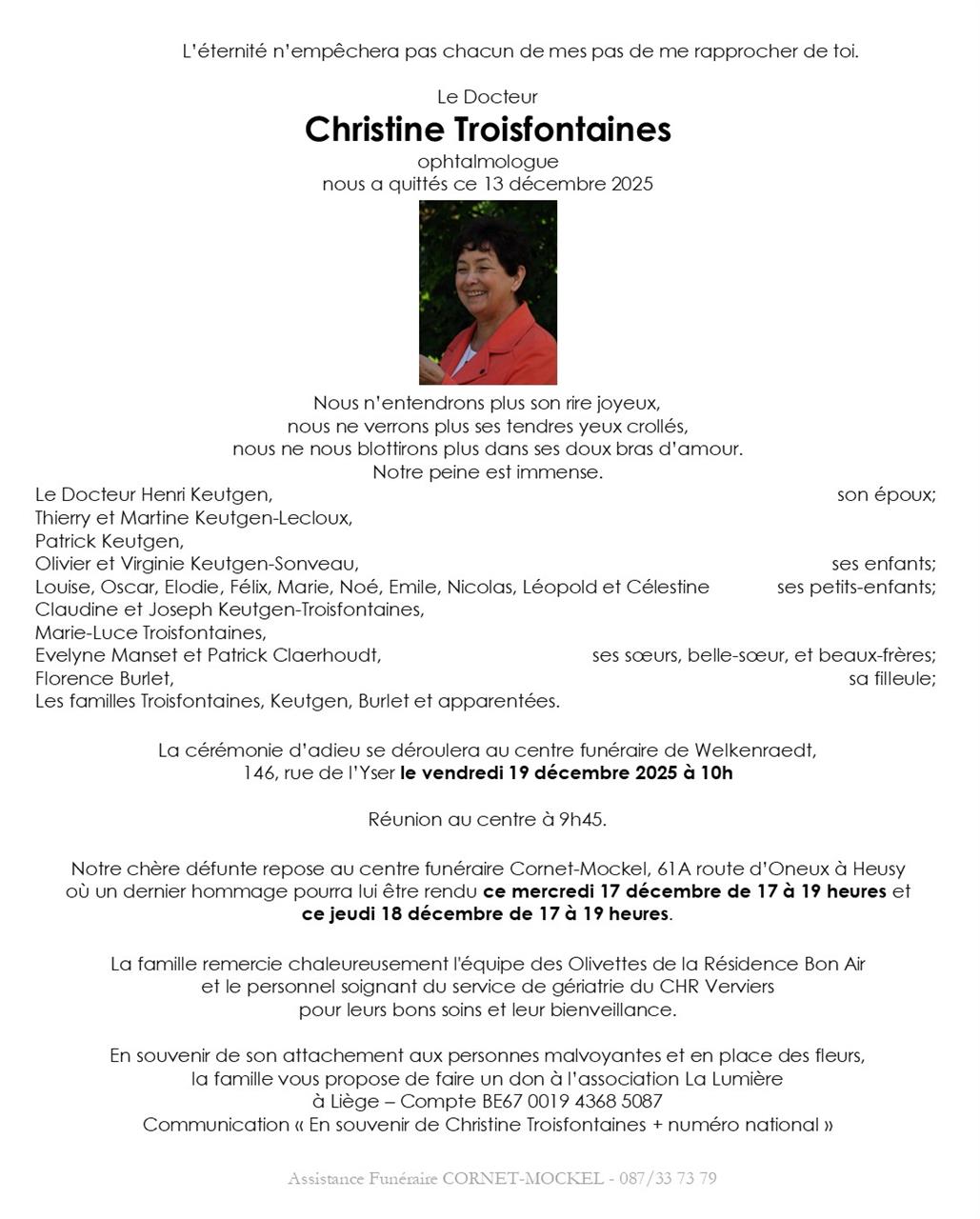 Décédée à Verviers (4800) le samedi 13 décembre 2025 à l'âge de 83 ans