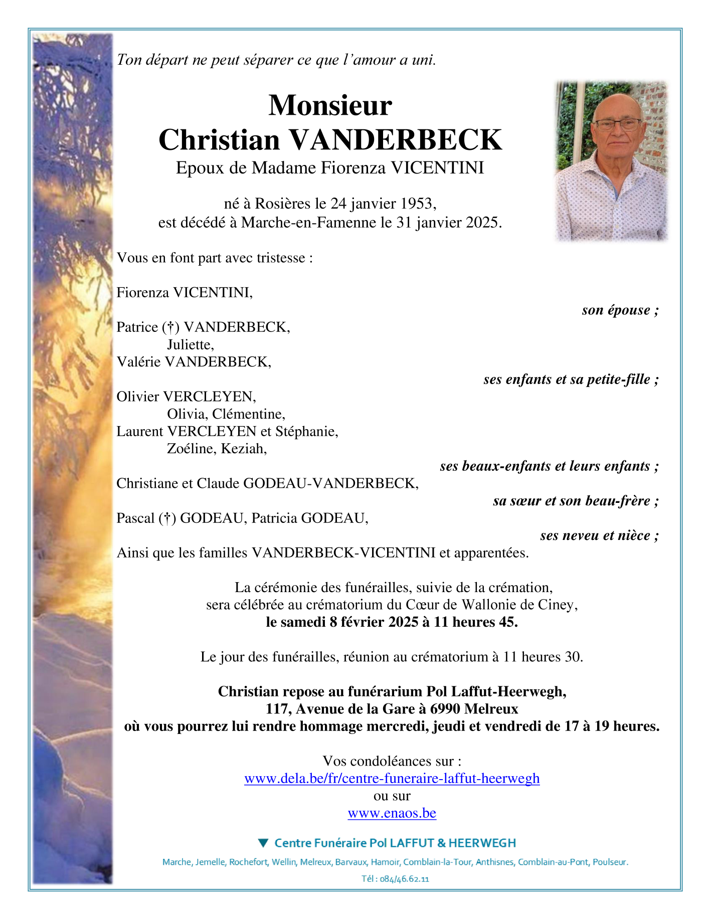 Fallecido en Marche-en-Famenne (6900) el viernes, 31 de enero de 2025 a la edad de 72 años