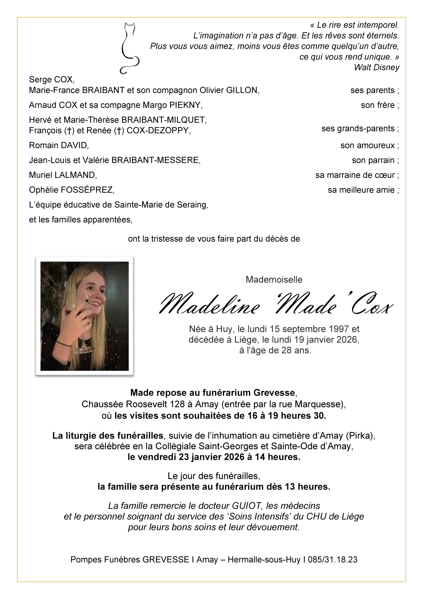 Décédée à Liège (4000) le lundi 19 janvier 2026 à l'âge de 28 ans