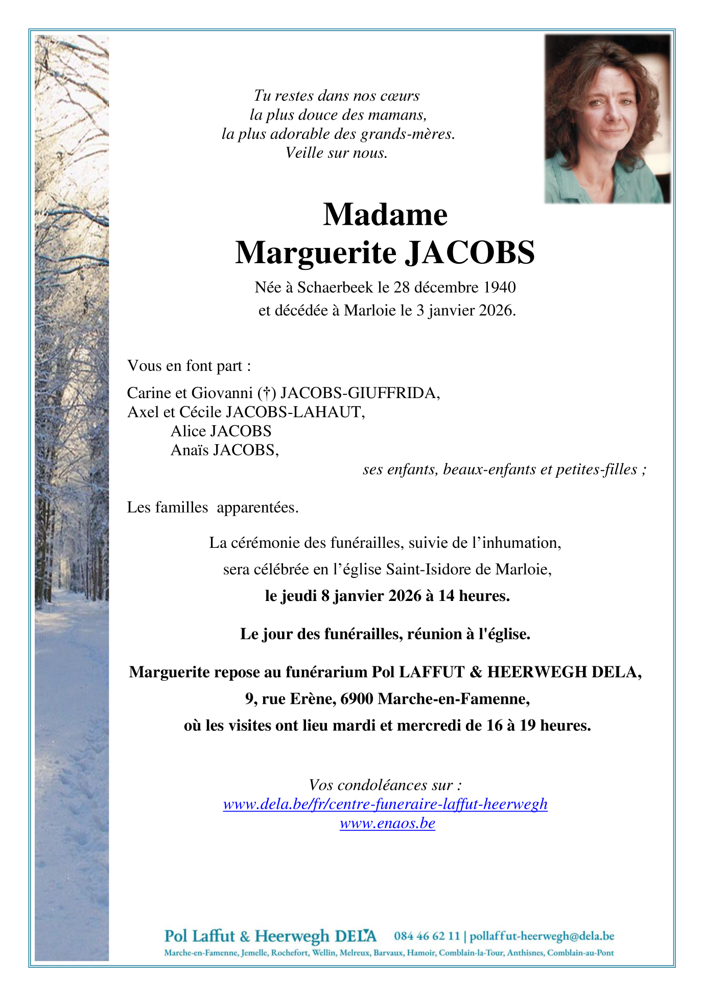 Fallecida en Marloie (6900) el sábado, 3 de enero de 2026 a la edad de 85 años