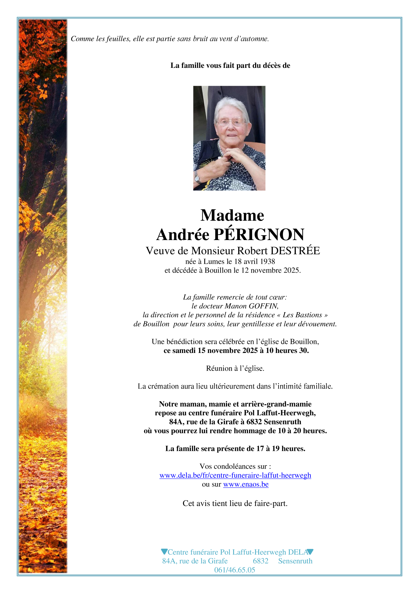 Fallecida en Bouillon (6830) el jueves, 13 de noviembre de 2025 a la edad de 87 años