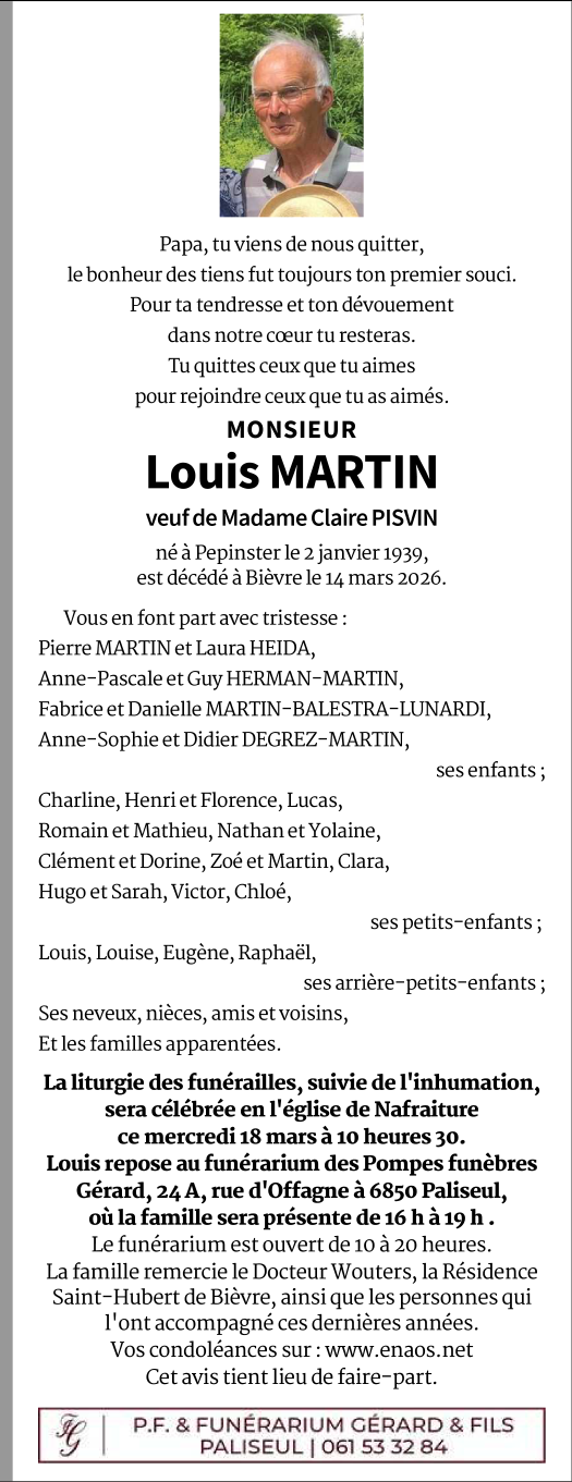 Décédé à Bievre (5555) le samedi 14 mars 2026 à l'âge de 87 ans