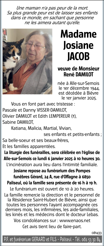 Fallecida en Bievre (5555) el miércoles, 1 de enero de 2025 a la edad de 80 años