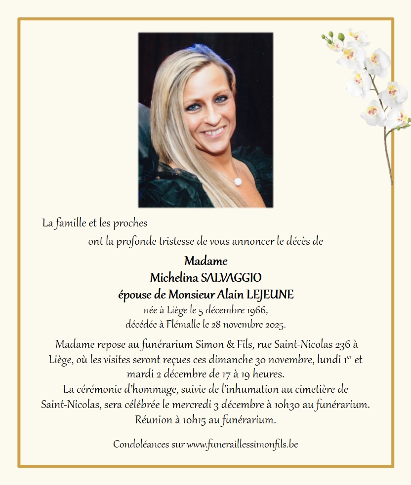 Décédée à Flémalle (4400) le vendredi 28 novembre 2025 à l'âge de 58 ans